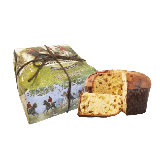 Panettone con dátiles, miel y almendras, envuelto a mano en elegante papel estilo Vintage.